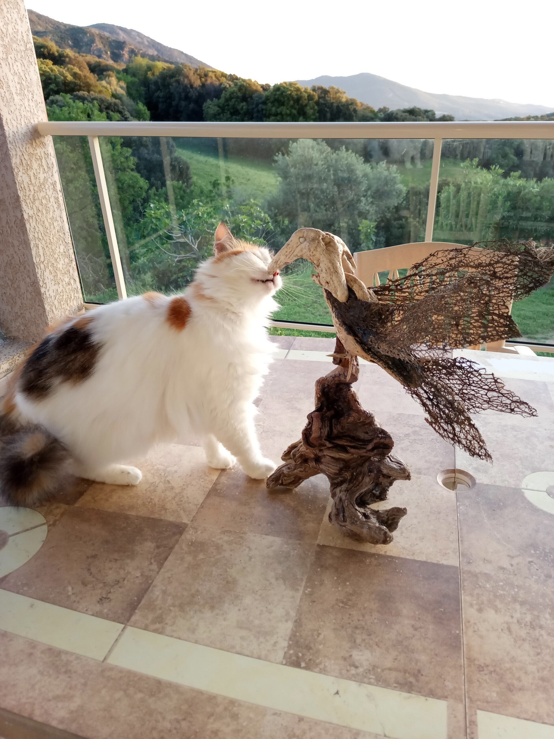 Chaque animal a sa propre personnalité et ses petites habitudes. Ici, découvrez l'un de nos moments préférés : notre chat faisant connaissance avec un oiseau en bois flotté, une scène qui témoigne de l'environnement stimulant et respectueux que nous créons pour tous nos pensionnaires, y compris les NAC.